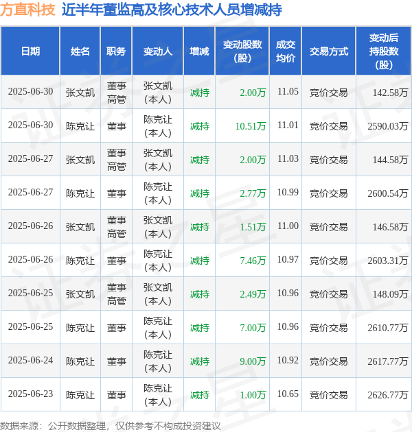 方直科技近半年内的董监高及核心技术人员增减持详情如下: